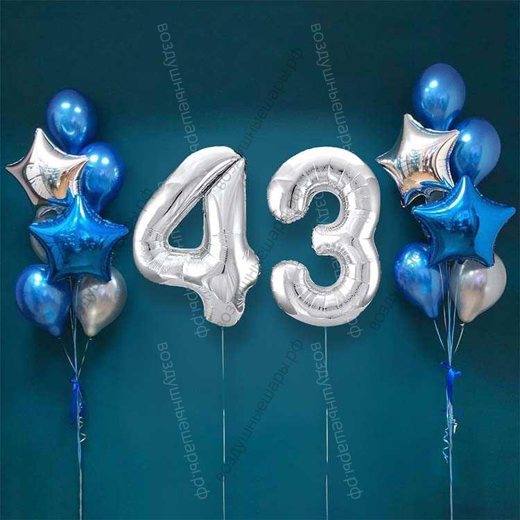 Закажите Шары на 43 года мужчине, сет "Серебристо-синий", 14 шариков с гелием и цифры, . недорого с доставкой по Москве прямо сейчас!
