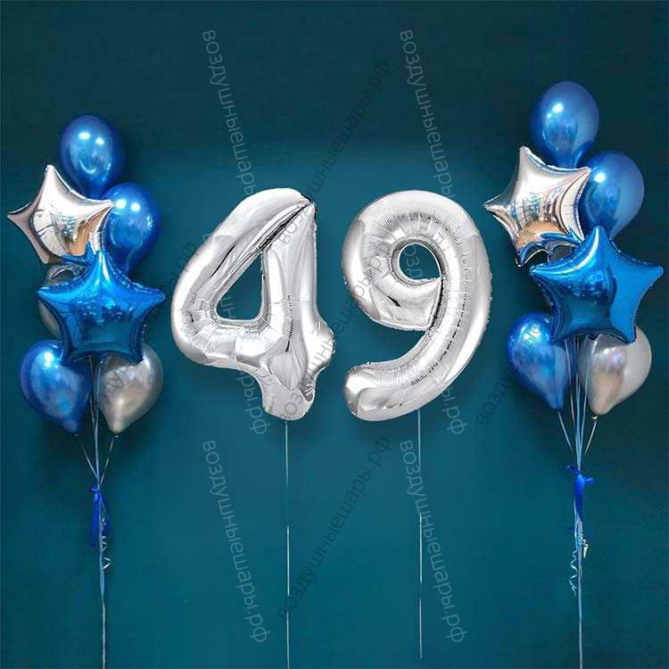 Закажите Шары на 49 лет мужчине, сет "Серебристо-синий", 14 шариков с гелием и цифры, . недорого с доставкой по Москве прямо сейчас!