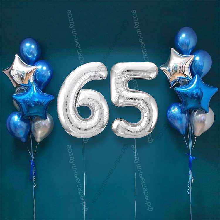 Шары на 65 лет мужчине, сет "Серебристо-синий", 14 шариков с гелием и цифры характеристики: