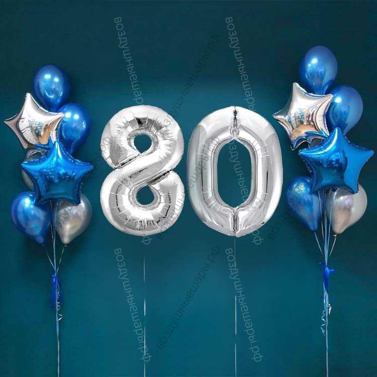 Шары на 80 лет мужчине, сет "Серебристо-синий", 14 шариков с гелием и цифры характеристики: