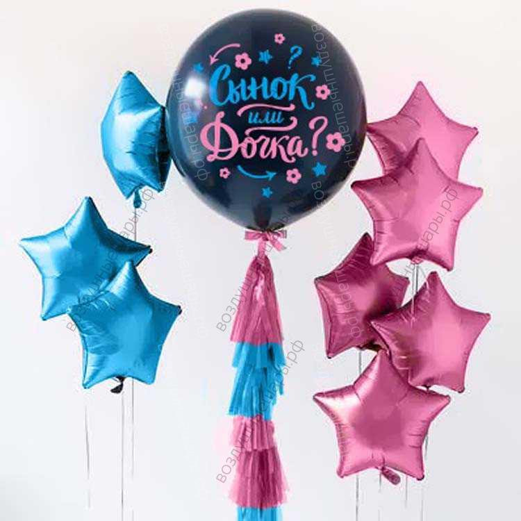 Шары на гендер пати гелиевые "Кто у нас?", большой шар с конфетти и тассел + 2 букета со звёздами