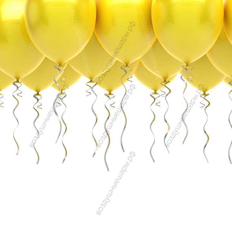 Шары под потолок желтые наполнены гелием и поднимаются вверх, образуя красивое облако и создавая праздничную атмосферу! К каждому шарику привязана ленточка- серпантин золотого или серебряного цвета, дополняющая картину праздника.