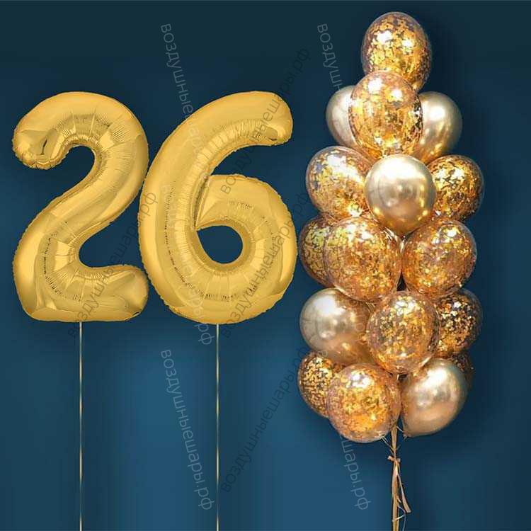 Шары с гелием на 26 лет, сет "Золотой Хром", 19 гелиевых шариков и золотые цифры характеристики:
