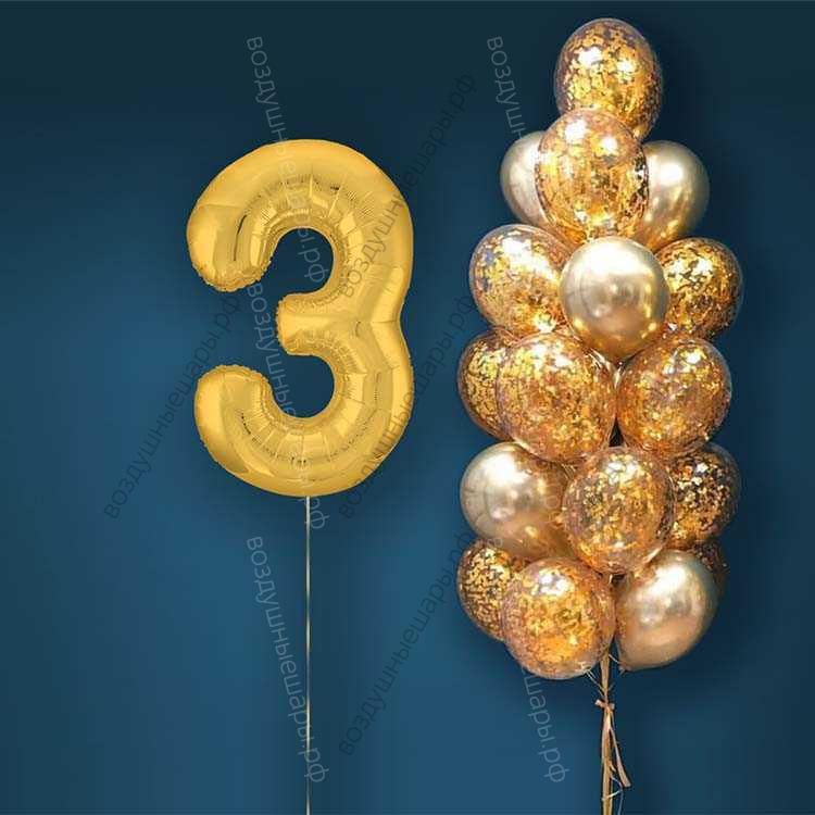 Шары с гелием на 3 года, сет "Золотой Хром", 19 гелиевых шариков и золотая цифра характеристики: