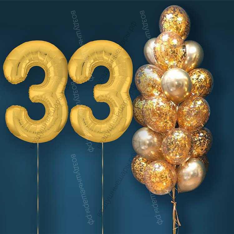 Шары с гелием на 33 года, сет "Золотой Хром", 19 гелиевых шариков и золотые цифры характеристики: