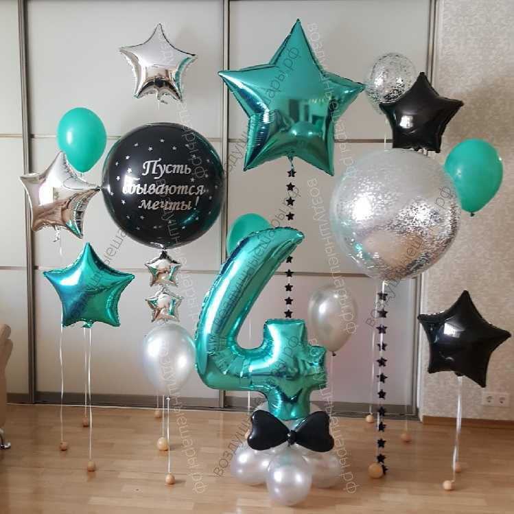 Основание этой композиции сделано из шаров с воздухом, а верхушка - это гелиевые шары и большие шары-цифры с гелием, которые придают ему объем и легкость одновременно. Мы обработаем каждый гелевый шарик специальным составом, продляющим срок его полета, благодаря чему ваш Стильная фотозона на день рождения мальчика Мне уже 4 года! будет радовать Вас несколько суток!