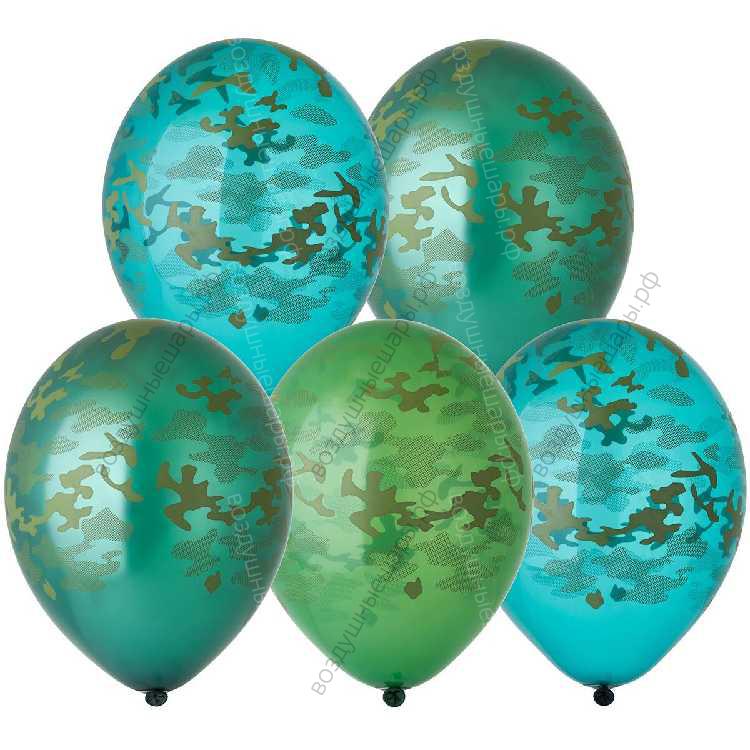 Воздушный шар с гелием Камуфляж, ассорти, 5 ст, 35 см., как и любые воздушные шары с гелием с рисунками, могут быть прозрачными, матовыми или перламутровыми (см. название).